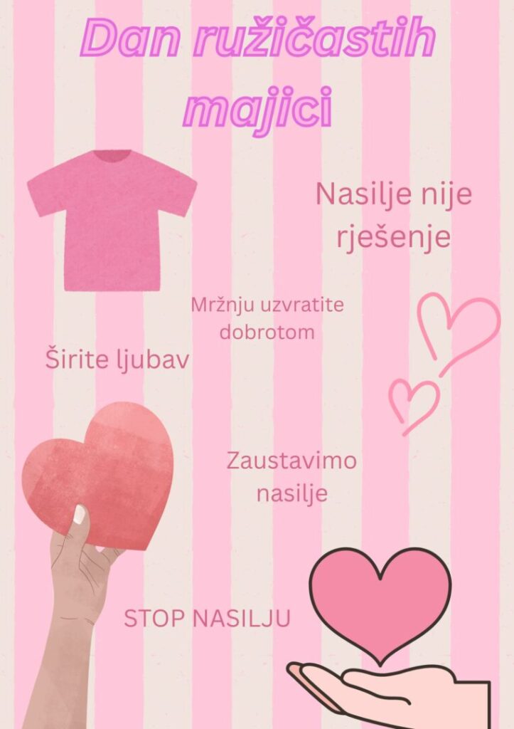 Dana 25. veljače u našoj je školi obilježen Dan ružičastih majica, poznat kao dan posvećen prevenciji vršnjačkog nasilja te promicanju tolerancije, empatije i međusobnog poštovanja.
