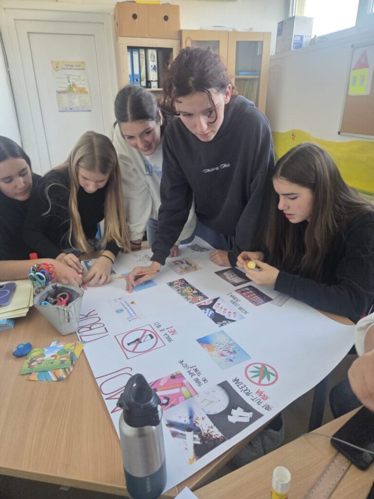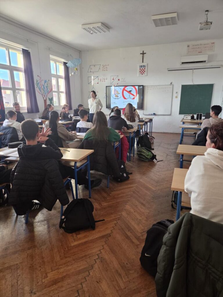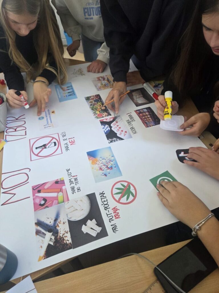 U našoj školi Mjesec borbe protiv ovisnosti obilježavali smo tijekom cijelog navedenog razdoblja kroz različite odgojno-obrazovne i preventivne aktivnosti. Učenice 8. razreda, u suradnji s pedagoginjom, izradile su prigodni plakat posvećen borbi protiv ovisnosti, čime su aktivno sudjelovale u promicanju važnih poruka prevencije među vršnjacima.