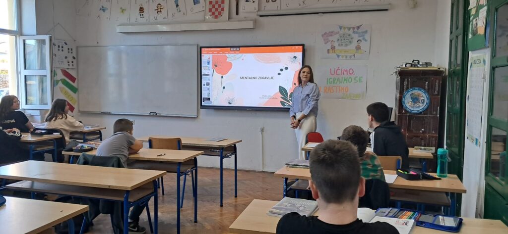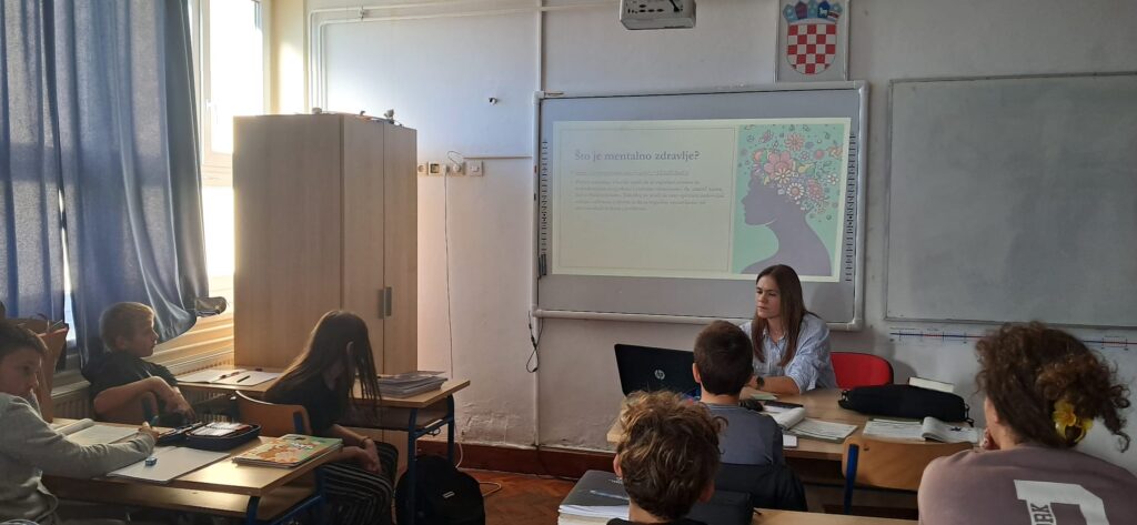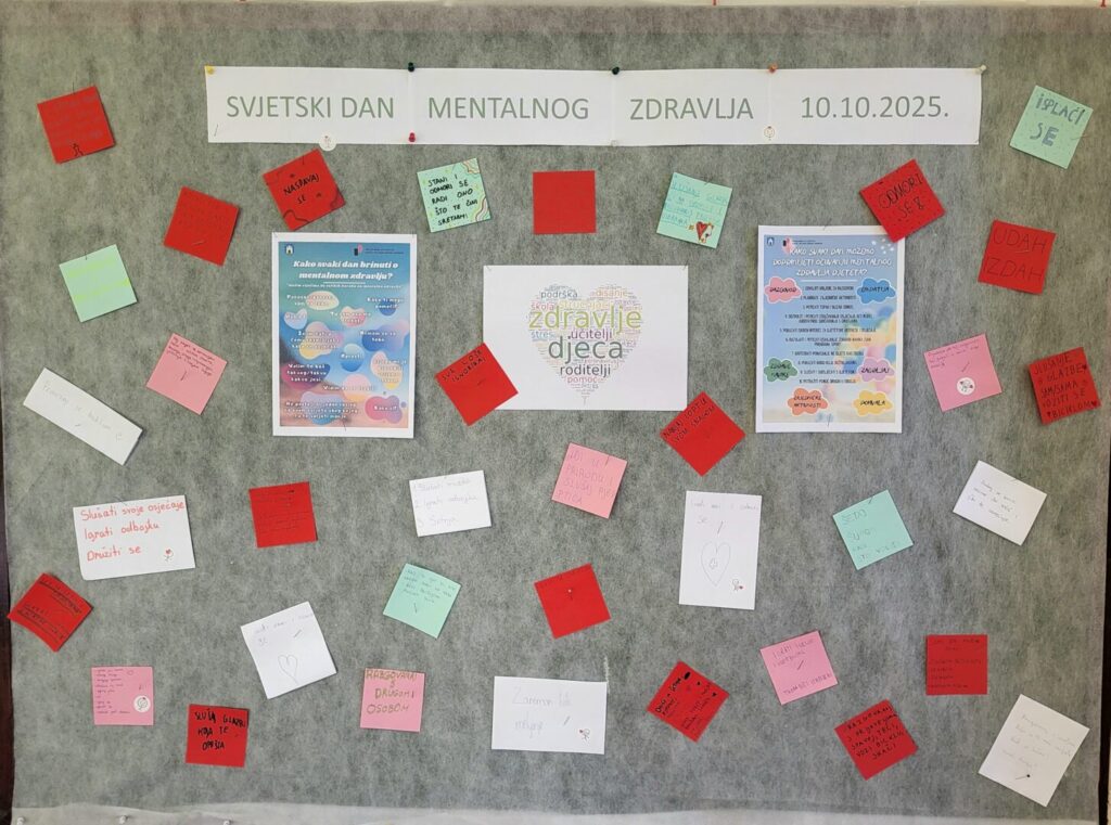10. listopada obilježava se Svjetski dan mentalnog zdravlja, s ciljem podizanja svijesti o važnosti brige za mentalno zdravlje i dobrobiti svakog pojedinca. Tim povodom stručna suradnica psihologinja Marija Lisica provela je radionice u 5., 6. i 7. razredu matične škole, tijekom kojih su učenici razgovarali o tome što za njih znači mentalno zdravlje te na koji način mogu brinuti o sebi i drugima. Na kraju radionice učenici su na papiriće zapisivali savjete i poruke podrške o tome kako poboljšati mentalno zdravlje, koje su zatim zajednički izložili na panou u školskom hodniku.